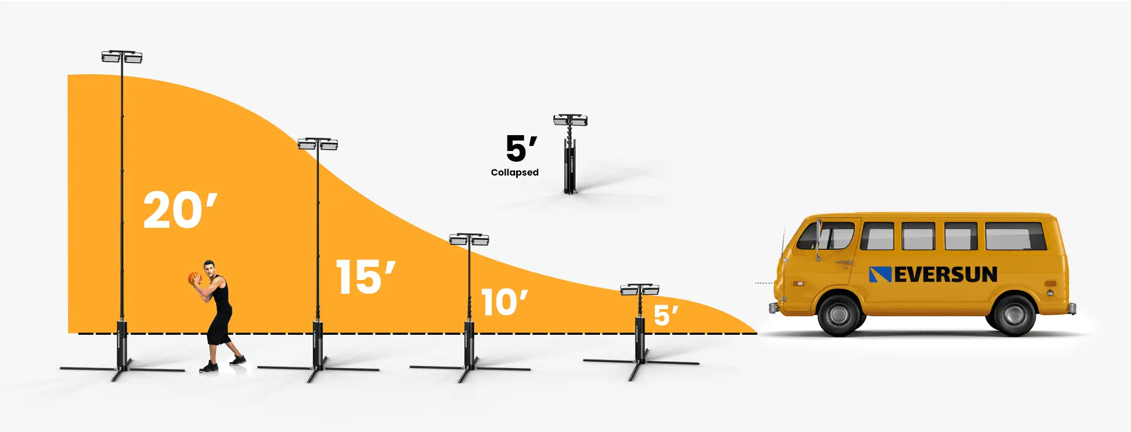 Footprint of only 12” x 8” x 50” when stowed. Adjustable height and 360° rotating LED heads adapt to any field or court.
